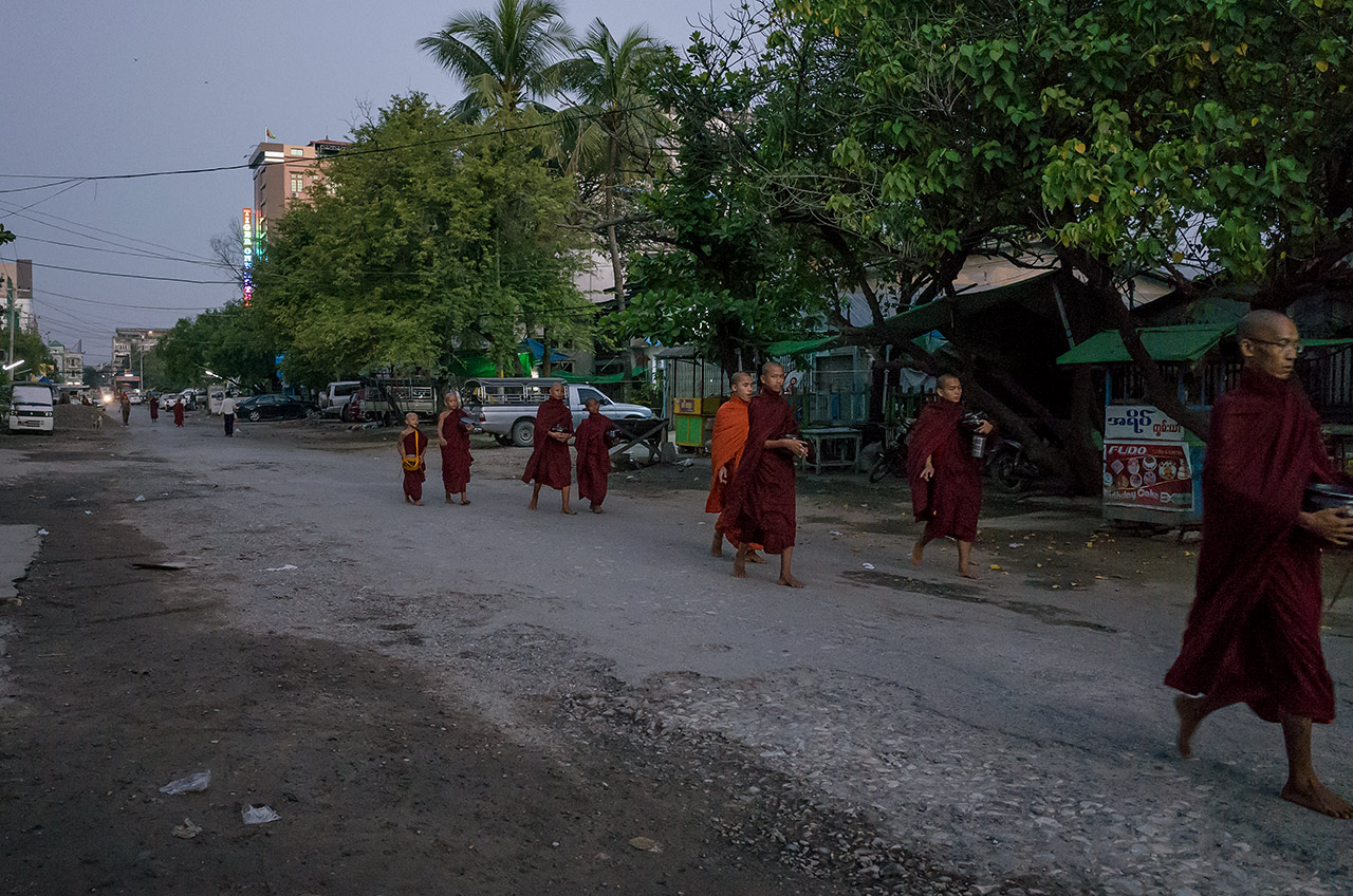 Bei Sonnenaufgang gehen die Mönche und Novizen barfuß durch den Stadtteil, der an das Kloster grenzt und sammeln das Essen ein. Mandalay, Myanmar, Oktober 2015