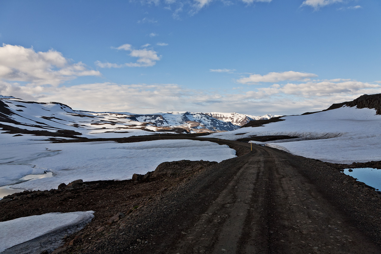 An Straße Mjóafjarðarvegur, Nr. 953 nach dem Ostfjord Mjóifjörður. Passhöhe. Island 2009