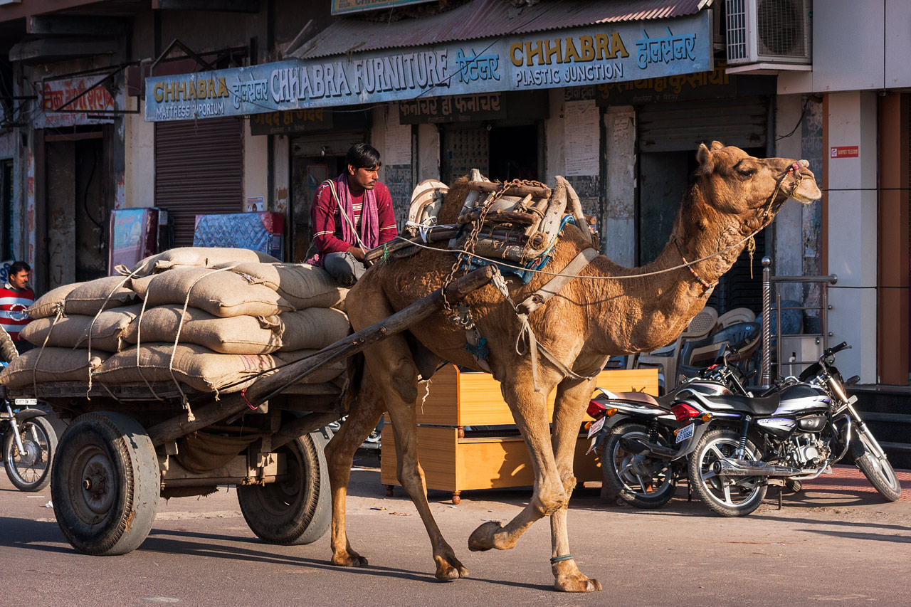Kamel-Fuhrwerke prägen das Straßenbild in Bikaner