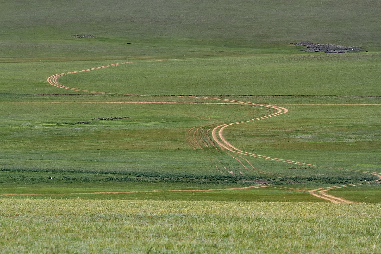 In der Mongolei gibt es nur wenige befestigte Straßen. Man fährt meistens über unbefestigte Pisten, das bedeutet, über eine bis vier Fahrspuren, die von vielen Vorgängern mit ihren Fahrzeugen in die Steppenlandschaft gezogen wurden.